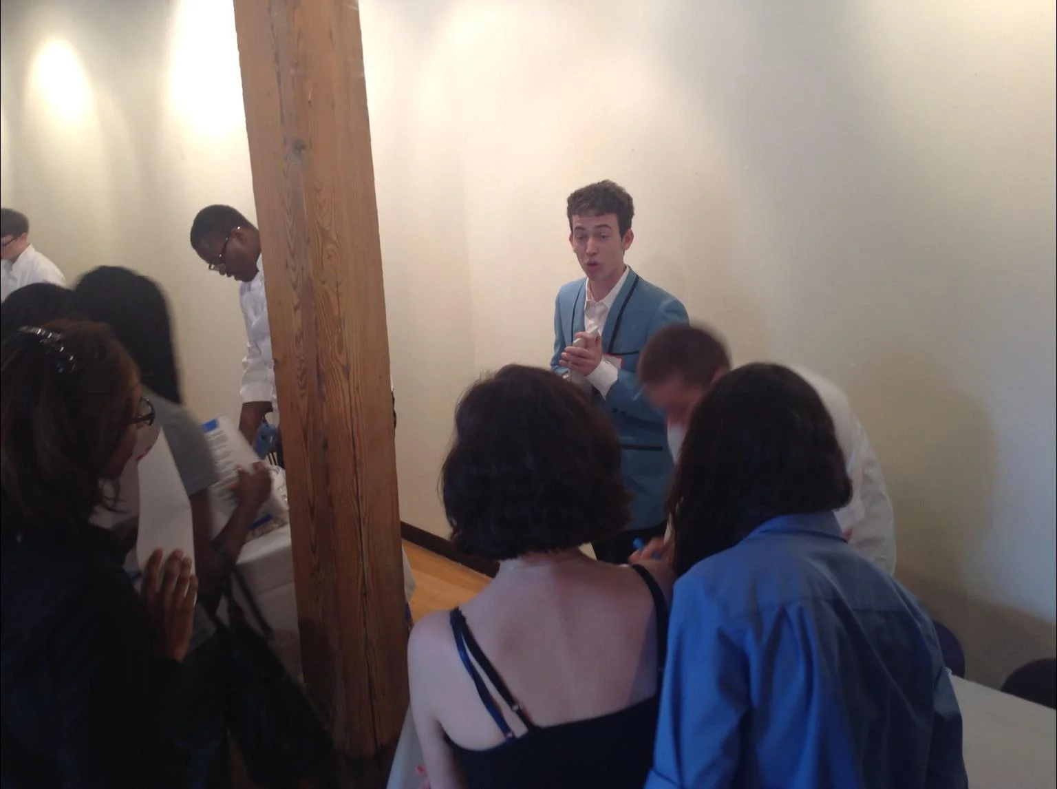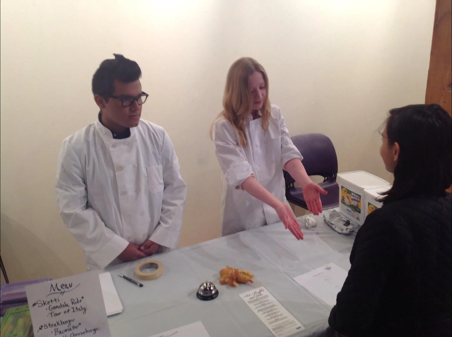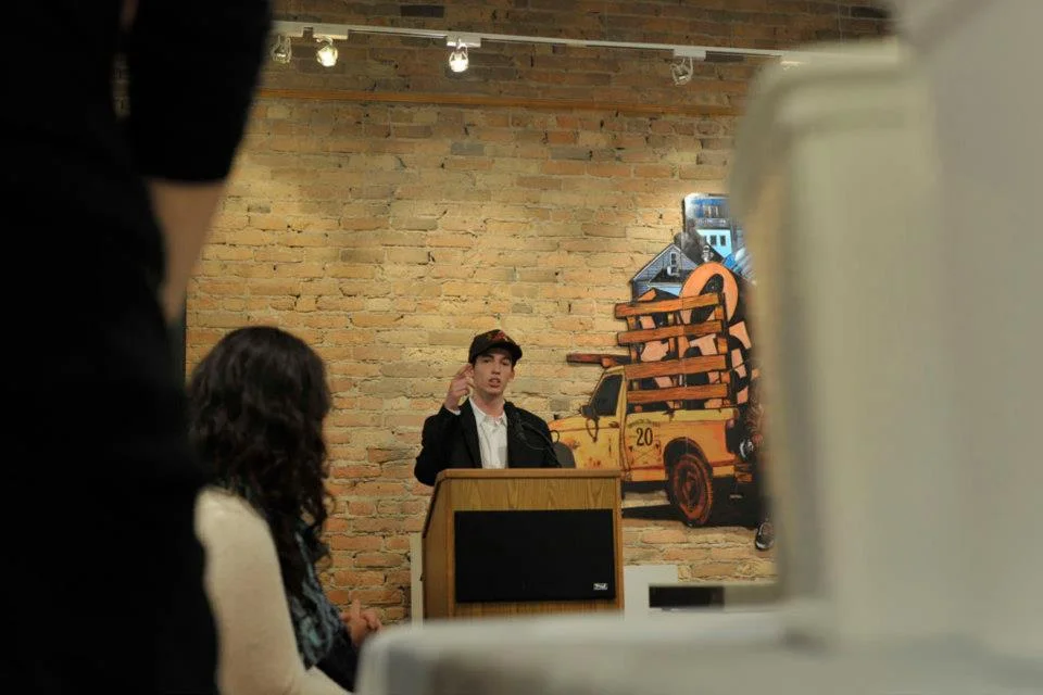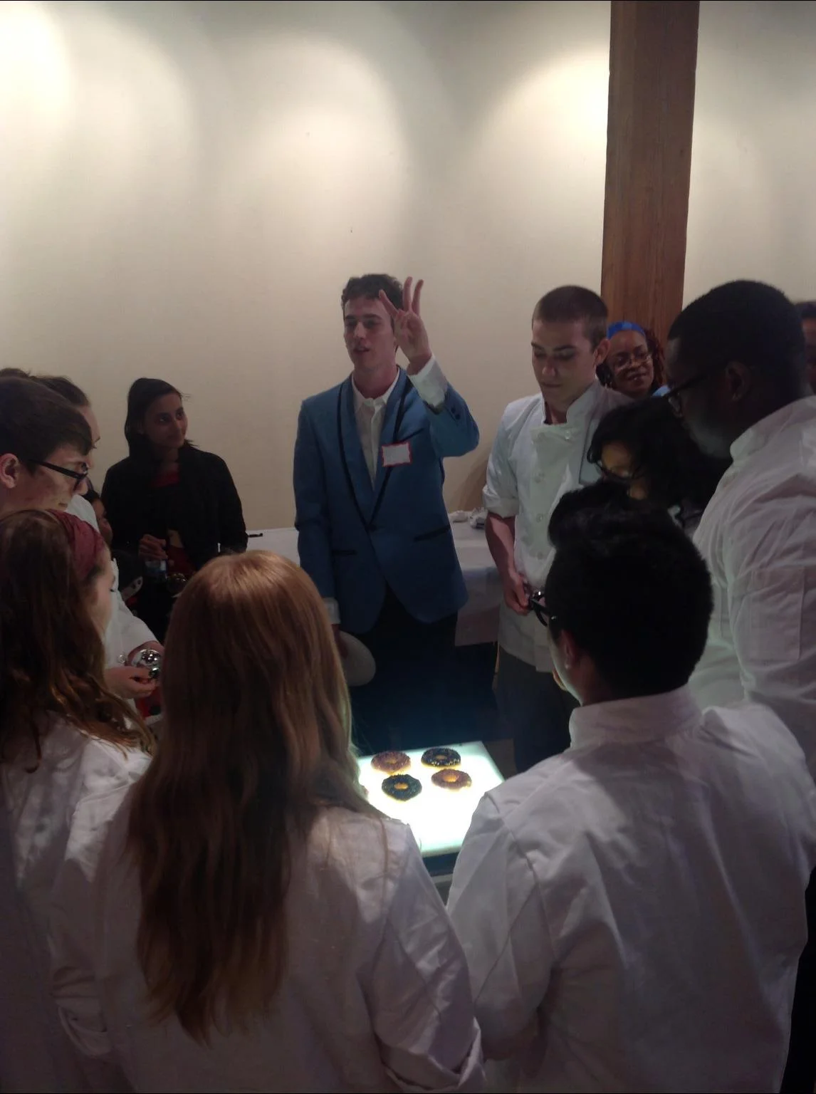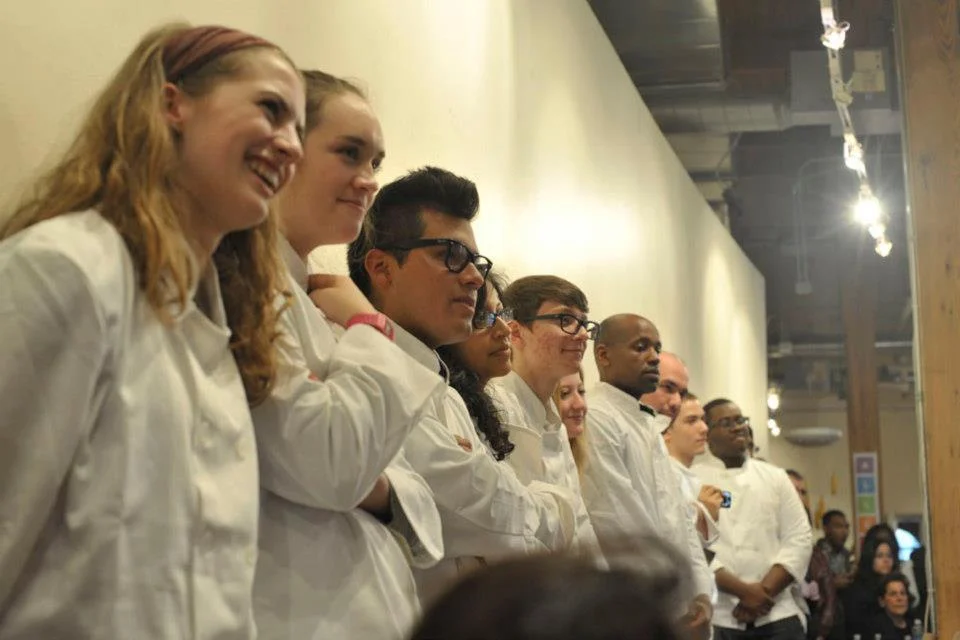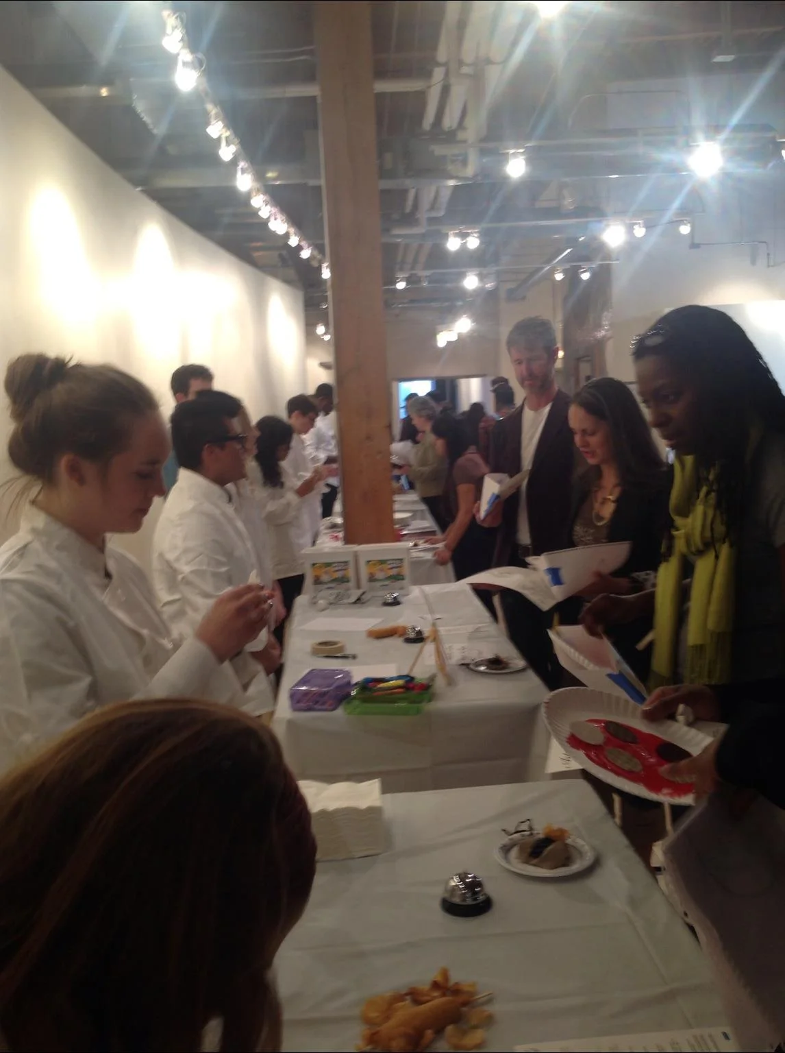 An event/performance commissioned by Alt-City: the fourth component of the Chicago Public Schools' All-City Visual Art Exhibition (April 26, 2013). Artists Maria Gaspar and Jorge Lucero worked with a small group of CPS high school students to produce a site-specific participatory project during the exhibition's closing event. The event was held at Gallery 37 and facilitated by Evan Plummer. Taking on the form of the ubiquitous food buffet, each student occupied a station wherein visitors were invited to receive a quickly-wrought, however highly conceptualized, work of art. Incrementally, throughout the evening, the collective of students would perform a type of dance they called "Gazed Donuts". This mini-work within the larger ART TROUGH saw the young practitioners leaving their buffet stations while ringing their call-bells; they gathered around a light table where half a dozen glazed donuts sat. They gazed at them for a set time (30 seconds) and then returned to their stations and resumed making small "carry out" works of art. The work ran for the duration of the entire CPS event. As an intermission for the work, one of the students (Morley) delivered a public speech in the form of a "press conference". This press conference was to announce his resignation from the company that created the "national chain of Art Troughs". The full body of that speech is forthcoming.