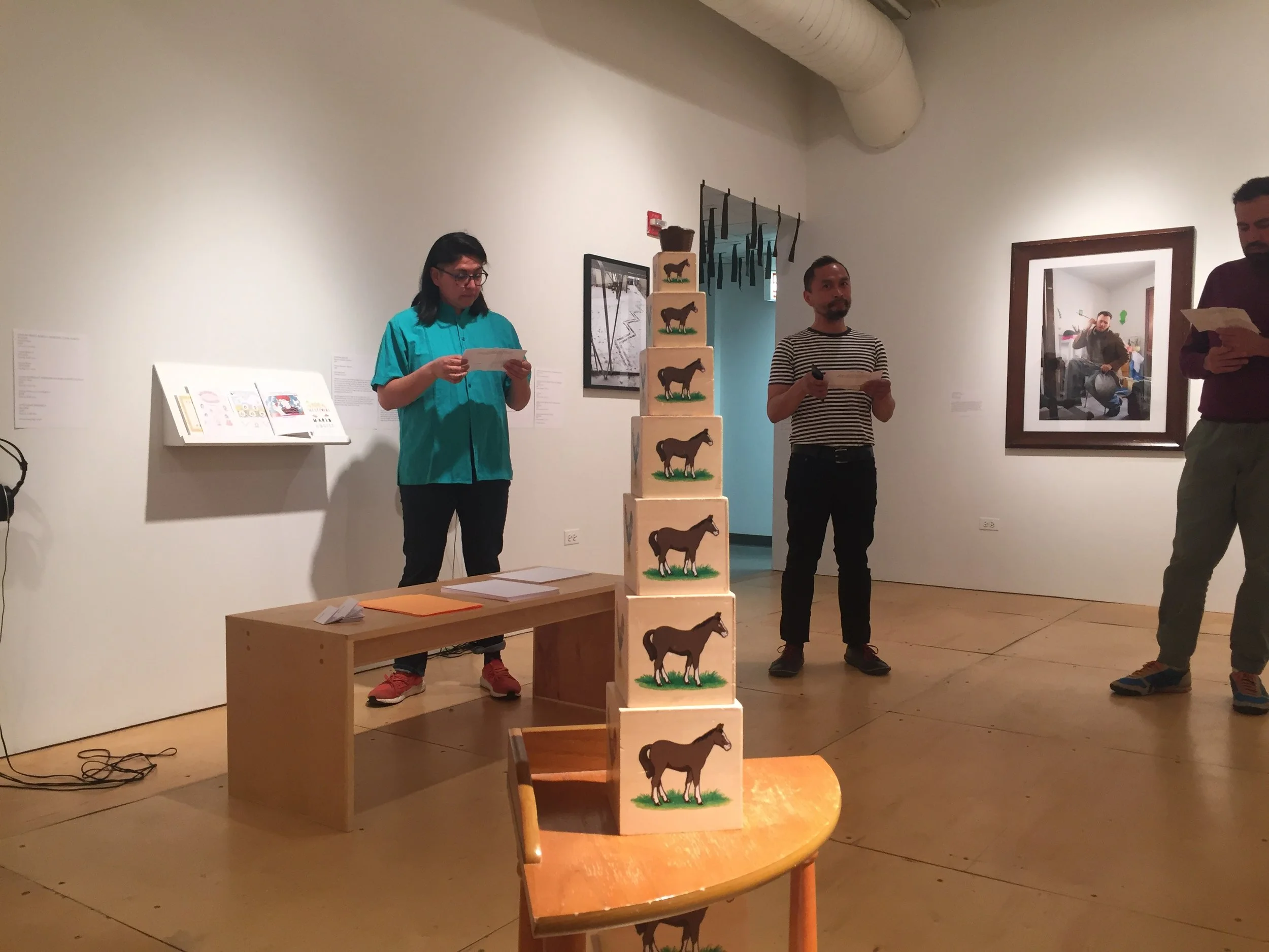 From April 26 to June 15, 2019 Chicago artist Alberto Aguilar had a retrospective at Gallery 400. As part of this major exhibition he invited many of his past collaborators to contribute programing during the run of the show. This programing ranged from artist’s performances to artist-led participatory events. All events were open to the general public. I created an artist-teacher professional development workshop in collaboration with Marcela Torres (Gallery 400), Scott Sikkema, and Mark Diaz (both Chicago Arts Partnerships in Education). The workshop—entitled A PD Invitation and conceived as an artwork itself— was held on May 11 and consisted of 9 participants and three parts: 1. A dialogue with Marcela about Alberto’s show around the question, “where is the pedagogy in art, and where is the art in pedagogy?”, 2. a creative response using only 8.5” x 11” sheets of paper led by Mark, and 3. a guided group conversation by Scott and I on Alberto’s rug piece Sensitive Equipment (2012). The poster for A PD Invitation (seen here) is purposefully not an actual Facebook invite, rather it is an Illustrator-drawn replica that mimicked Alberto’s Facebook invitation for his 2009 A Personal Dinner Invitation, from which the name A PD Invitation is derived.